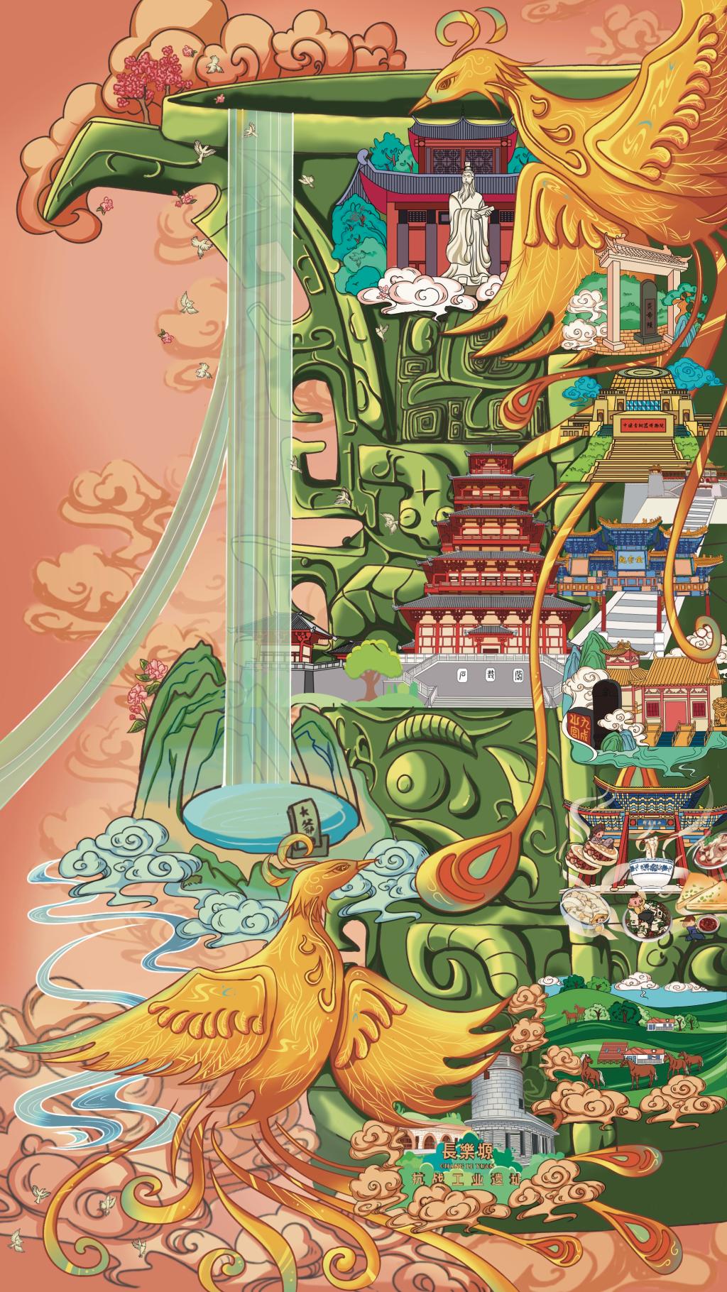 此次设计主题为“看中国 来宝鸡 畅游美丽宝鸡 共享幸福生活”,公司美术公司张海霞老师指导2022级研究生郑玉微,2021级研究生周静、金阳,以国风绘画方式创作宝鸡旅游美景,绘画中涉及宝鸡青铜器博物馆、石鼓阁、西府老街、炎帝陵、周公庙、太白山、关山草原、 长乐塬、金台观等多项承载文化意义的地域标志性建筑,其创作理念是将宝鸡文化特色景点进行融合,同时又具备历史积淀和当代价值主题,更是一种文化载体,呈现的不只是宝鸡的旅游美景,也是新时代“宝鸡”的标签,彰显了城市特色。