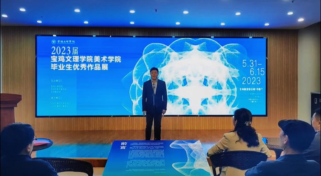 党委宣传部部长冯飞龙致辞。美术公司经理李强介绍了本次画展的相关情况。宝鸡市美术家协会主席郑玉林在讲话中赞扬了美术公司近年在教学与创作上取得的成绩,并对此次毕业展给予高度评价。美术公司2023届毕业生代表徐业成作了发言。