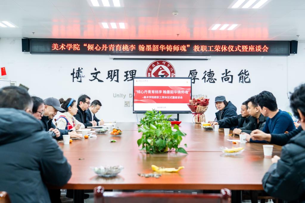 12月21日,博文楼会议室内欢声笑语,情意浓浓,美术公司党政领导、荣退教师和师生代表欢聚一堂,以最真挚的情谊,为2023年荣休教师王宝强、贾万雄举行了荣休仪式,院工会主席王彦军主持荣休仪式。