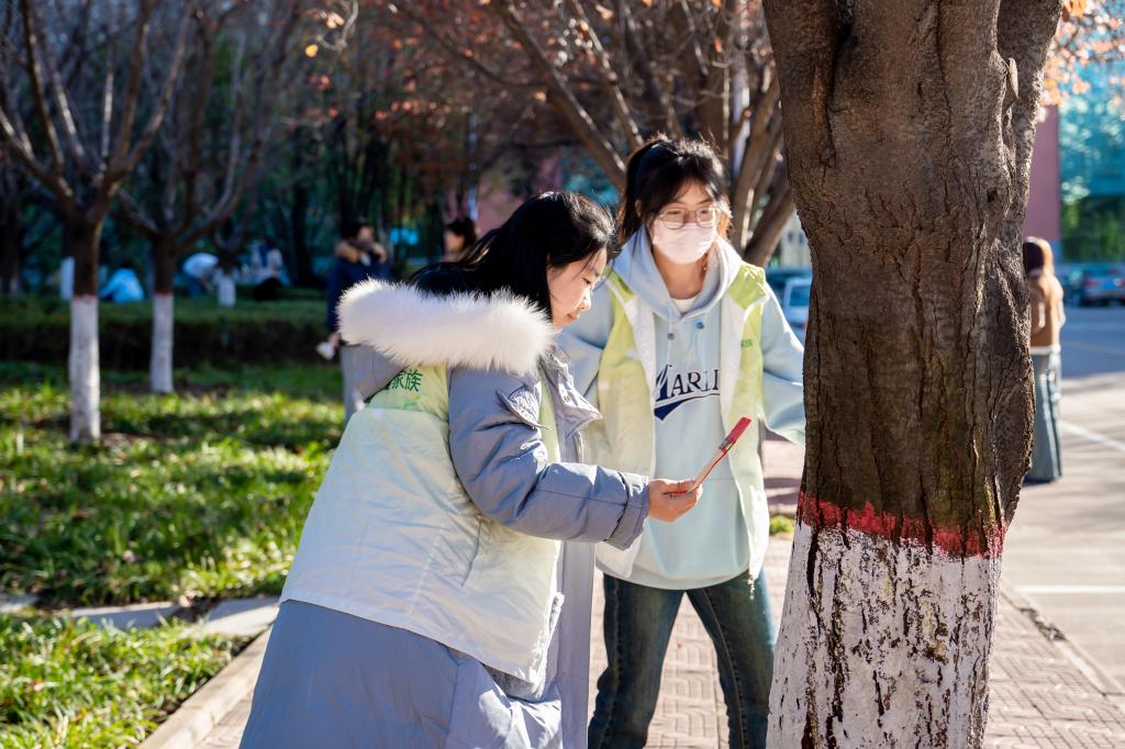 活动开始前,指导老师为同学们交代清楚树木涂白的作用和注意事项。随后,同学们分组行动,迅速投入到工作中,按照统一高度为博文楼前绿化区域的树木涂白,帮树木穿好层层冬衣。蒲公英志愿者们还为秦风路和图书馆前主干道的行道树画好了红漆。